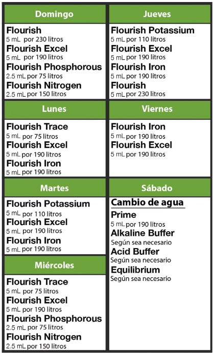 Añada 2,5 ml por cada 70 litros (20 galones) según sea necesario en respuesta a los signos de deficiencia de Fósforo.