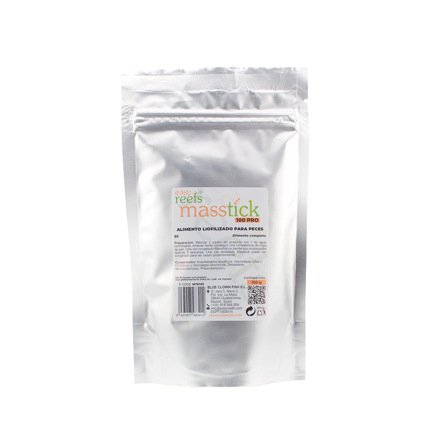 Masstick® es una pasta autoadhesiva que se presenta en modo de polvo, listo para ser rehidratado. La presentación en polvo rehidratable permite que Masstick® pueda ser empastado con pulpa de moluscos o crustáceos, huevos de pescado, de moluscos o crustáceos, artemias, mysidaceos, copépodos, rotíferos, y medicamentos administrables por vía oral.