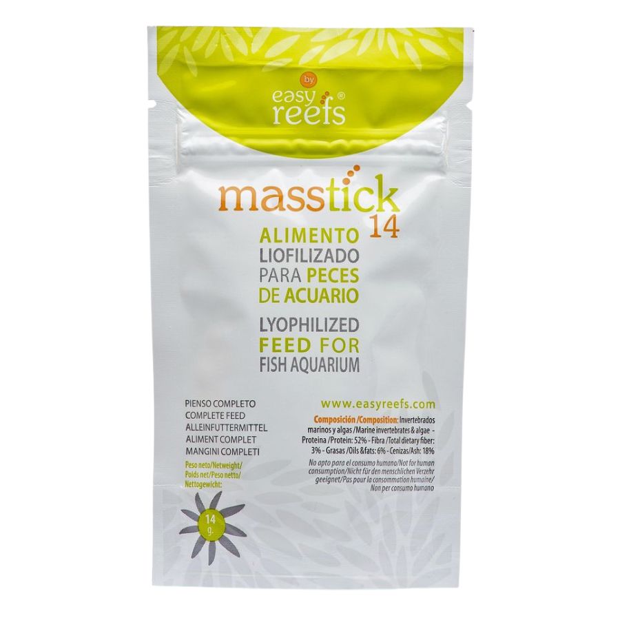 Esta mezcla de altísimo contenido proteínico es ideal para la alimentación de peces de acuario, así como de corales y otros invertebrados. Con Masstick® se obtiene un crecimiento importante en los peces, mayor intensidad en los colores y mejora en el sistema inmune, lo que provoca una drástica reducción en enfermedades.