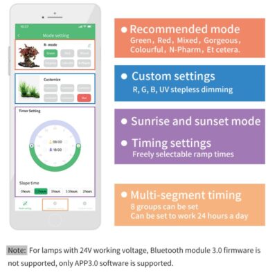 El control mediante App por Bluetooth permite regular intensidad, color, horarios y modos personalizados como amanecer y atardecer.