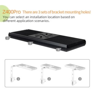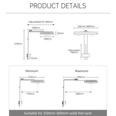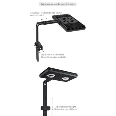 Incluye un soporte de techo ajustable, compatible con acuarios de 350 a 600 mm de ancho, y es posible instalarla también mediante cables de suspensión, según las opciones del fabricante.